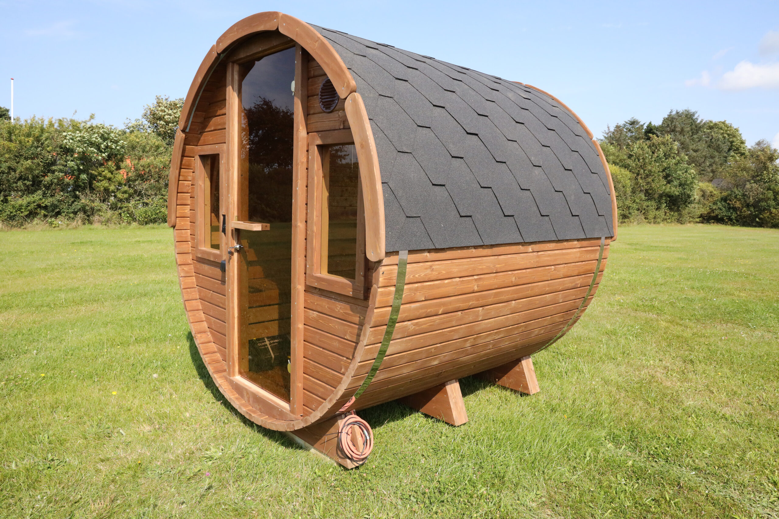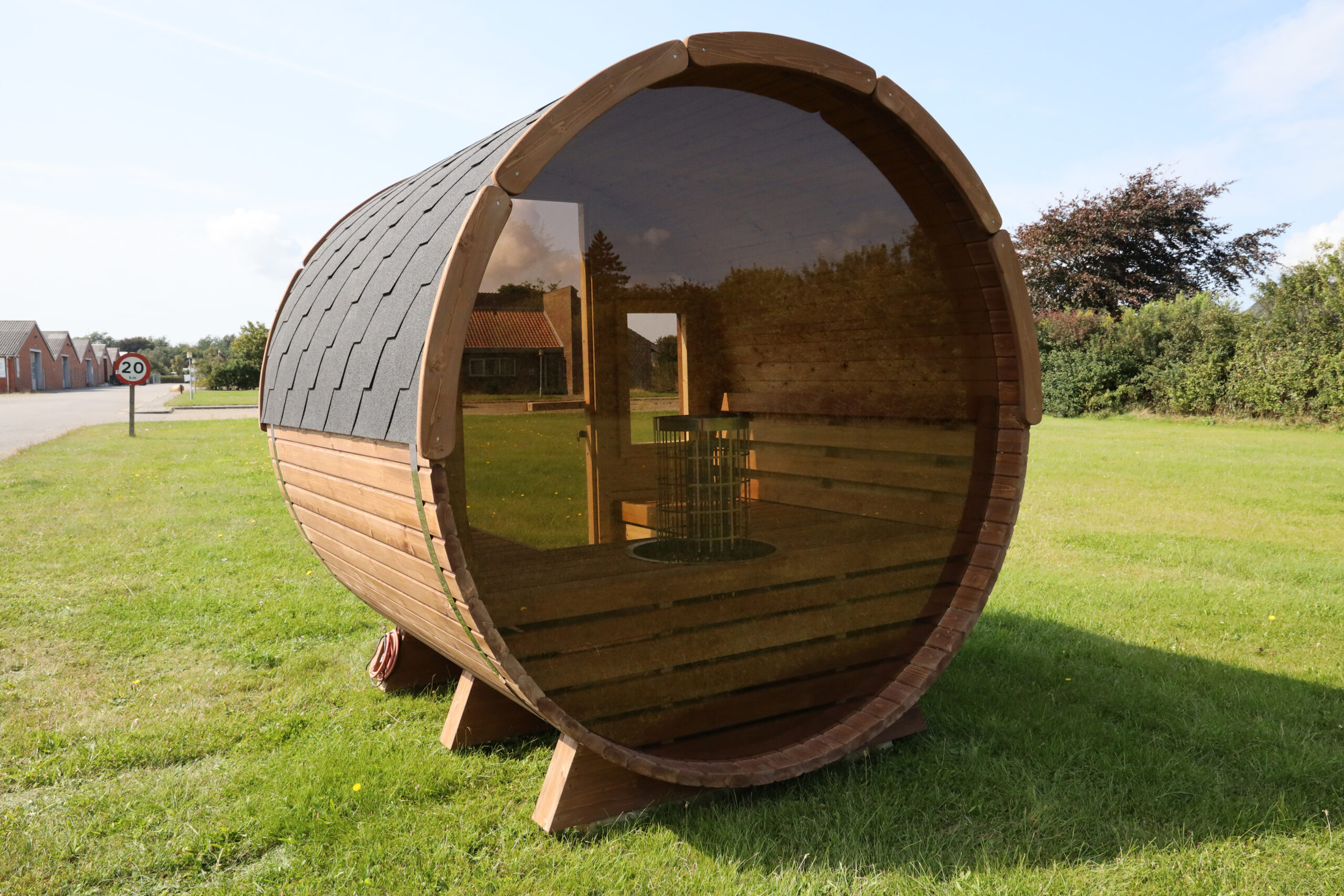 Vi leverer med egen chauffør til kantsten. Aflæsning er ikke inkluderet, så du skal selv stå for at kunne aflæsse saunen af lastbilen med enten kran eller truck. Kontakt os for hjælp til aflæsning.